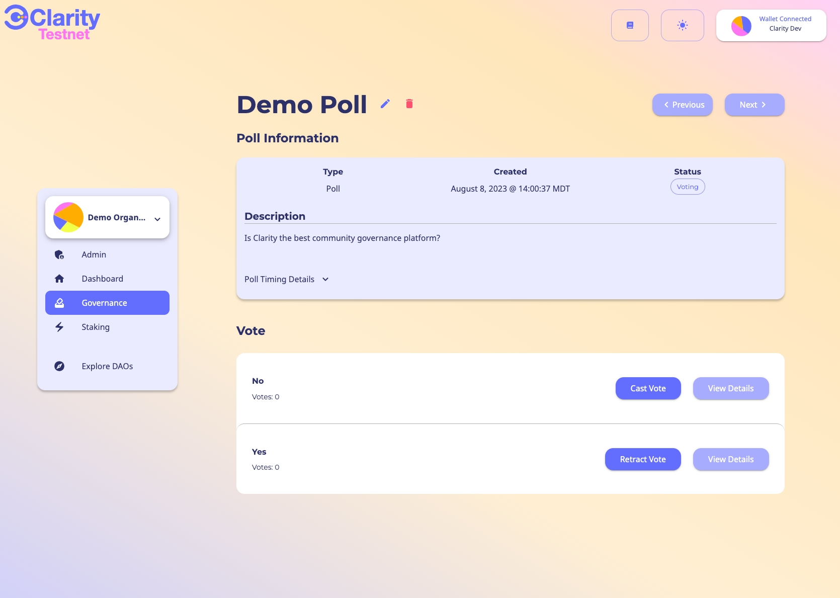 意見調査とバウンティの投票権は、ユーザーがウォレットに保有するガバナンストークンの数によって決定されます。意見調査やバウンティの投票力としてカウントするために資産がステークされる必要はありません。