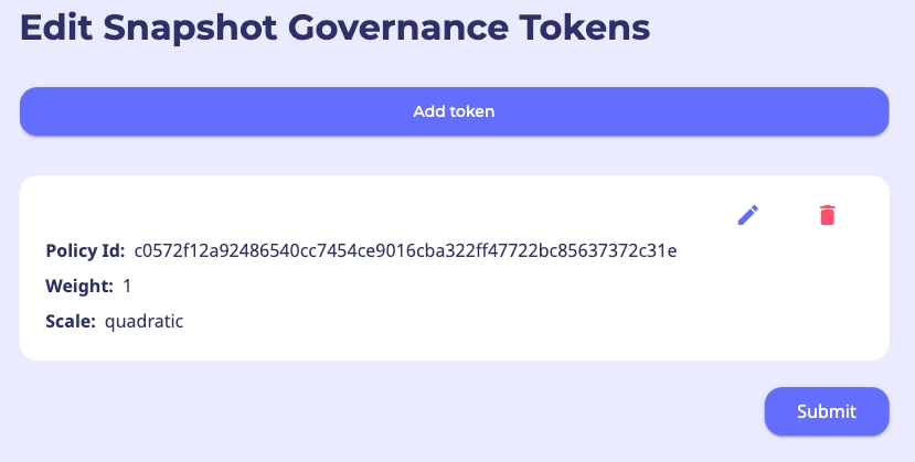 「スナップショットガバナンストークンの編集」'で、編集するトークンを見つけます。そのトークンの編集アイコンをクリックします。