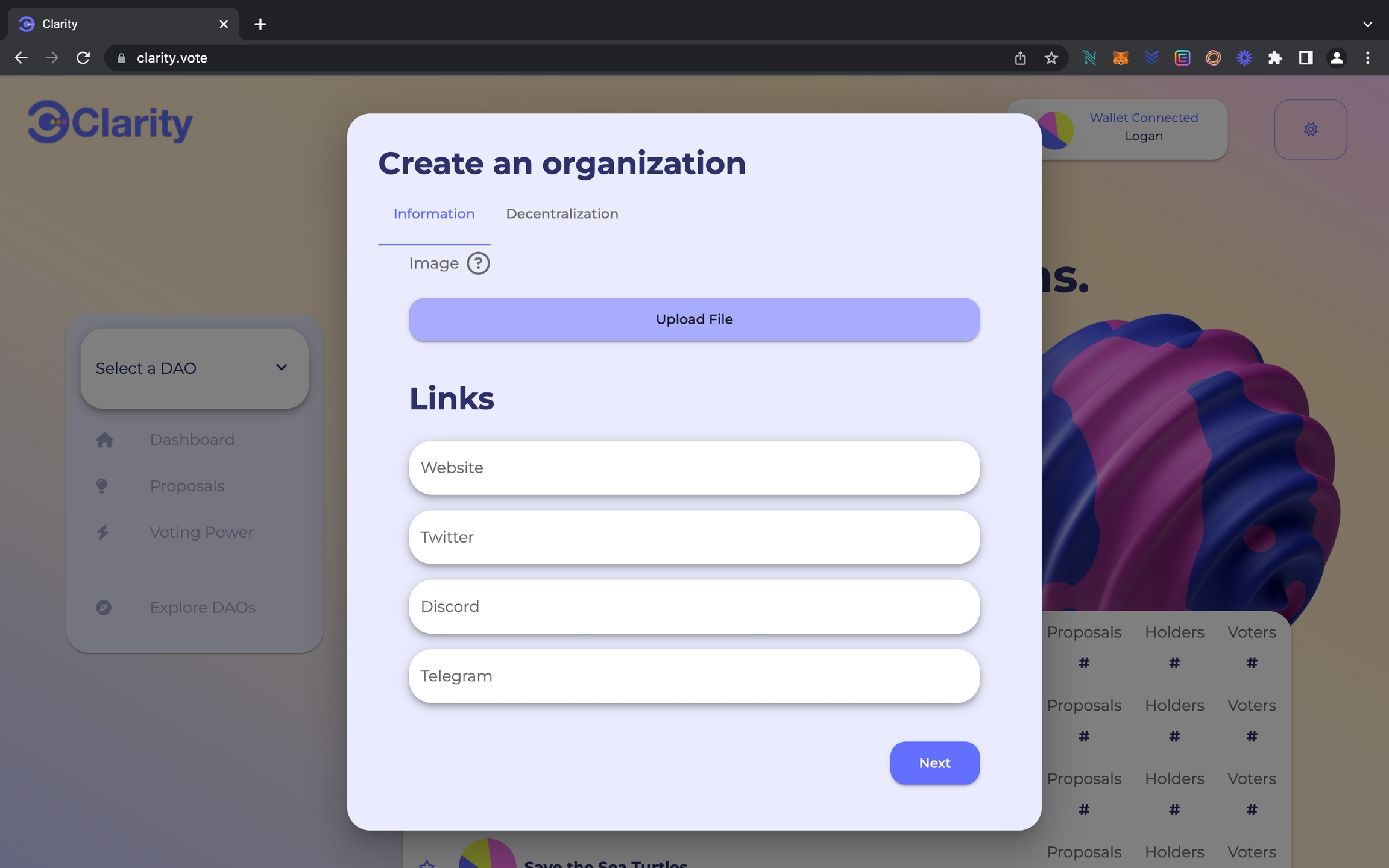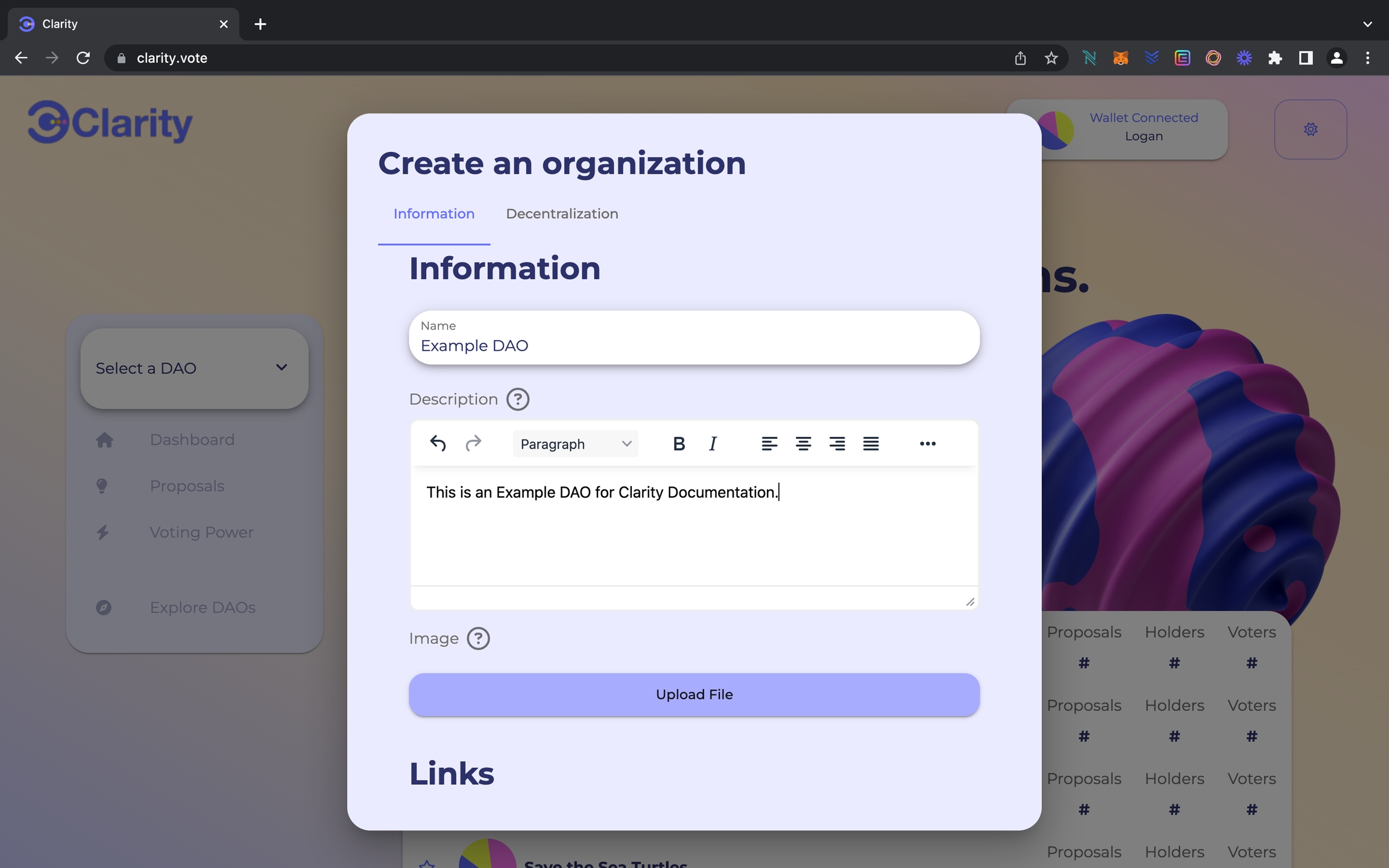 Clarityで発見しやすいように、組織に関するオフチェーン情報を入力します。