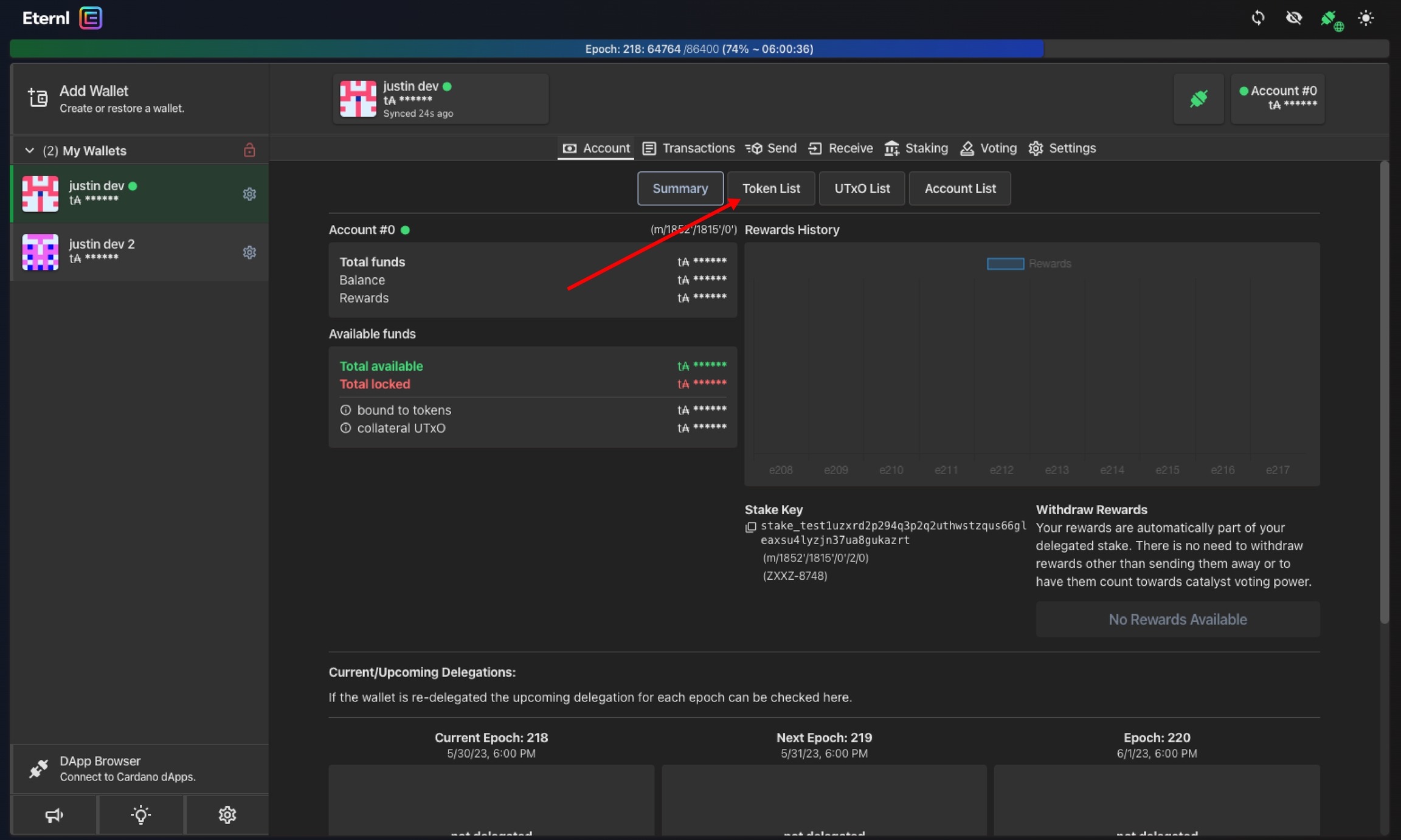 ステップ1:ご希望のガバナンス トークンを保持しているEternlウォレットを開き、トークンリストに移動します。